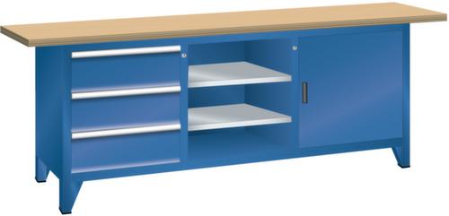 "longDescription": "LISTA Systemwerkbank, BxTxH: 2000x700x840mm, Material: Multiplex, 40mm stark, Max. Belastung: 1000kg, Anzahl Schubladen: 6, Anzahl Fronthöhen (Tragkraft): 6x150mm (70kg), Schubladen-Nutzfläche BxT: 459x510mm, Fächer mit Türen: 2x450mm, Anzahl Fachböden: 2 (50kg), Schliessart: Key Lock, Standard-Schliessung mit Wechselzylinder inkl. 2 Schlüsseln mit Schlüsselnummer, Farbe Gehäuse: Lichtgrau RAL 7035, Farbe Schubladen/Türen: Enzianblau RAL 5010. Höchste Stabilität: Gehäuse bis 1,0 t belastbar, kraftschlüssige Steck- und Schraubverbindungen. Platzsparende und übersichtliche Lagerung in variablen Unterbauten mit leichtgängigen Schubladen mit bis zu 70 kg Tragkraft und vielfältigem Einteilungsmaterial. Sichere Verschliessbarkeit mit Schliesssystem Key Lock zur gleichzeitigen Sicherung aller Schubladen und Türen vor ungewolltem Zugriff<br>",