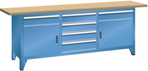 "longDescription": "LISTA Systemwerkbank, BxTxH: 2000x700x840mm, Material: Multiplex, 40mm stark, Max. Belastung: 1000kg, Anzahl Schubladen: 3, Anzahl Fronthöhen (Tragkraft): 3x200mm (70kg), Schubladen-Nutzfläche BxT: 459x510mm, Fächer mit Türen: 1x600mm, Anzahl Fachböden: 4 (50kg), Schliessart: Key Lock, Standard-Schliessung mit Wechselzylinder inkl. 2 Schlüsseln mit Schlüsselnummer, Farbe Gehäuse: Lichtgrau RAL 7035, Farbe Schubladen/Türen: Capriblau RAL 5019. Höchste Stabilität: Gehäuse bis 1,0 t belastbar, kraftschlüssige Steck- und Schraubverbindungen. Platzsparende und übersichtliche Lagerung in variablen Unterbauten mit leichtgängigen Schubladen mit bis zu 70 kg Tragkraft und vielfältigem Einteilungsmaterial. Sichere Verschliessbarkeit mit Schliesssystem Key Lock zur gleichzeitigen Sicherung aller Schubladen und Türen vor ungewolltem Zugriff<br>",