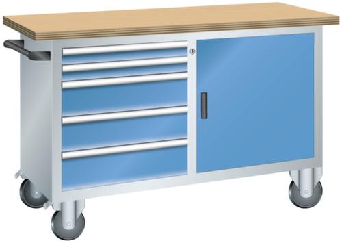 "longDescription": "LISTA Systemwerkbank fahrbar, BxTxH: 1250x700x877mm, Material: Multiplex, 40mm stark, Max. Belastung: 400kg, Anzahl Schubladen: 6, Anzahl Fronthöhen (Tragkraft): 2x75mm (70kg), 4x150mm (70kg), Schubladen-Nutzfläche BxT: 459x510mm, Fächer mit Türen: 1x450mm, Anzahl Fachböden: 1 (50kg), Schliessart: Key Lock, Standard-Schliessung mit Wechselzylinder inkl. 2 Schlüsseln mit Schlüsselnummer, Ausstattung: 1 Schiebegriff, 4 Rollenträger mit 2 Bock- und 2 Lenkrollen mit Feststellern (Vollgummi ø 100mm), Farbe Gehäuse: Lichtgrau RAL 7035, Farbe Schubladen/Türen: Capriblau RAL 5019. Höchste Stabilität: Gehäuse bis 1,0 t belastbar, kraftschlüssige Steck- und Schraubverbindungen. Platzsparende und übersichtliche Lagerung in variablen Unterbauten mit leichtgängigen Schubladen mit bis zu 70 kg Tragkraft und vielfältigem Einteilungsmaterial. Sichere Verschliessbarkeit mit Schliesssystem Key Lock zur gleichzeitigen Sicherung aller Schubladen und Türen vor ungewolltem Zugriff. Volle Mobilität bei Ausstattung mit Gummirollen für den mobilen Einsatz an verschiedenen Arbeitsplätzen<br>",
