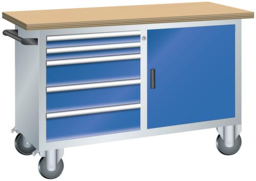 "longDescription": "LISTA Systemwerkbank fahrbar, BxTxH: 1250x700x877mm, Material: Multiplex, 40mm stark, Max. Belastung: 400kg, Anzahl Schubladen: 6, Anzahl Fronthöhen (Tragkraft): 2x75mm (70kg), 4x150mm (70kg), Schubladen-Nutzfläche BxT: 459x510mm, Fächer mit Türen: 1x450mm, Anzahl Fachböden: 1 (50kg), Schliessart: Key Lock, Standard-Schliessung mit Wechselzylinder inkl. 2 Schlüsseln mit Schlüsselnummer, Ausstattung: 1 Schiebegriff, 4 Rollenträger mit 2 Bock- und 2 Lenkrollen mit Feststellern (Vollgummi ø 100mm), Farbe Gehäuse: Lichtgrau RAL 7035, Farbe Schubladen/Türen: Signalblau RAL 5005. Höchste Stabilität: Gehäuse bis 1,0 t belastbar, kraftschlüssige Steck- und Schraubverbindungen. Platzsparende und übersichtliche Lagerung in variablen Unterbauten mit leichtgängigen Schubladen mit bis zu 70 kg Tragkraft und vielfältigem Einteilungsmaterial. Sichere Verschliessbarkeit mit Schliesssystem Key Lock zur gleichzeitigen Sicherung aller Schubladen und Türen vor ungewolltem Zugriff. Volle Mobilität bei Ausstattung mit Gummirollen für den mobilen Einsatz an verschiedenen Arbeitsplätzen<br>",