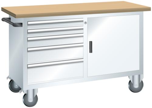 "longDescription": "LISTA Systemwerkbank fahrbar, BxTxH: 1250x700x877mm, Material: Multiplex, 40mm stark, Max. Belastung: 400kg, Anzahl Schubladen: 5, Anzahl Fronthöhen (Tragkraft): 2x75mm (70kg), 1x100mm (70kg), 1x150mm (70kg), 1x200mm (70kg), Schubladen-Nutzfläche BxT: 459x510mm, Fächer mit Türen: 1x600mm, Anzahl Fachböden: 2 (50kg), Schliessart: Key Lock, Standard-Schliessung mit Wechselzylinder inkl. 2 Schlüsseln mit Schlüsselnummer, Ausstattung: , Farbe Gehäuse: Lichtgrau RAL 7035, Farbe Schubladen/Türen: Reinweiss RAL 9010. Höchste Stabilität: Gehäuse bis 1,0 t belastbar, kraftschlüssige Steck- und Schraubverbindungen. Platzsparende und übersichtliche Lagerung in variablen Unterbauten mit leichtgängigen Schubladen mit bis zu 70 kg Tragkraft und vielfältigem Einteilungsmaterial. Sichere Verschliessbarkeit mit Schliesssystem Key Lock zur gleichzeitigen Sicherung aller Schubladen und Türen vor ungewolltem Zugriff. Volle Mobilität bei Ausstattung mit Gummirollen für den mobilen Einsatz an verschiedenen Arbeitsplätzen<br>",