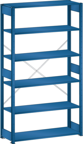 "longDescription": "LISTA Universalregal, BxTxH: 1300x600x2500mm, Anzahl Fachböden: 6 Fachböden geschlitzt, 25mm stark, Ausstattung: Grundfeld mit 2 Regalstützenpaare inkl. 6 Tiefenstreben, 1 Diagonalkreuz verzinkt, Fachlast: 220kg, Max. Feldlast: 2800kg, Farbe: Enzianblau RAL 5010. Schnelle und einfache Montage durch schraubenlose Steckmontage aller Grundbauteile und Fachböden. Jederzeit anpassbar an neues Lagergut durch den flexiblen Ein- und Umbau von Fachböden, Schubladen und Einzelteilen im 25-mm-Raster. Maximale Regalausnutzung dank einer Kantungshöhe der Fachböden von nur 25 mm für volle Ordnerhöhe<br>",