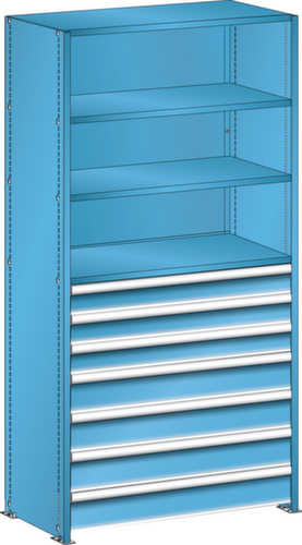 "longDescription": "LISTA Universalregal, BxTxH: 1000x500x2000mm, Anzahl Fachböden: 4 Fachböden glatt, 25mm stark, Ausstattung: Grundfeld mit 2 Vollblech Seitenwände, 1 Rückwand, glatt (2-teilig), 7 Schubladen (3x100mm, 4x150mm, Tragkraft 50kg, Vollauszug), Fachlast: 160kg, Max. Feldlast: 1000kg, Farbe: Lichtblau RAL 5012. Schnelle und einfache Montage durch schraubenlose Steckmontage aller Grundbauteile und Fachböden. Jederzeit anpassbar an neues Lagergut durch den flexiblen Ein- und Umbau von Fachböden, Schubladen und Einzelteilen im 25-mm-Raster. Maximale Regalausnutzung dank einer Kantungshöhe der Fachböden von nur 25 mm für volle Ordnerhöhe<br>",