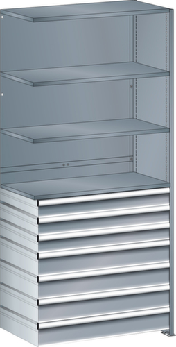 "longDescription": "LISTA Universalregal, BxTxH: 1000x500x2200mm, Anzahl Fachböden: 4 Fachböden glatt, 25mm stark, Ausstattung: Anbaufeld mit 1 Vollblech Seitenwand, 1 Rückwand, glatt (2-teilig), 7 Schubladen (3x100mm, 4x150mm, Tragkraft 50kg, Vollauszug), Fachlast: 160kg, Max. Feldlast: 1000kg, Farbe: Grau metallic NCS S 6502-B. Schnelle und einfache Montage durch schraubenlose Steckmontage aller Grundbauteile und Fachböden. Jederzeit anpassbar an neues Lagergut durch den flexiblen Ein- und Umbau von Fachböden, Schubladen und Einzelteilen im 25-mm-Raster. Maximale Regalausnutzung dank einer Kantungshöhe der Fachböden von nur 25 mm für volle Ordnerhöhe<br>",
