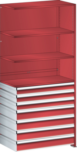 "longDescription": "LISTA Universalregal, BxTxH: 1000x500x2200mm, Anzahl Fachböden: 4 Fachböden glatt, 25mm stark, Ausstattung: Anbaufeld mit 1 Vollblech Seitenwand, 1 Rückwand, glatt (2-teilig), 7 Schubladen (3x100mm, 4x150mm, Tragkraft 50kg, Vollauszug), Fachlast: 160kg, Max. Feldlast: 1000kg, Farbe: Rubinrot RAL 3003. Schnelle und einfache Montage durch schraubenlose Steckmontage aller Grundbauteile und Fachböden. Jederzeit anpassbar an neues Lagergut durch den flexiblen Ein- und Umbau von Fachböden, Schubladen und Einzelteilen im 25-mm-Raster. Maximale Regalausnutzung dank einer Kantungshöhe der Fachböden von nur 25 mm für volle Ordnerhöhe<br>",