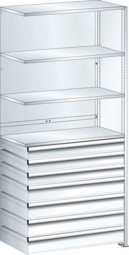 "longDescription": "LISTA Universalregal, BxTxH: 1000x500x2200mm, Anzahl Fachböden: 4 Fachböden glatt, 25mm stark, Ausstattung: Anbaufeld mit 1 Vollblech Seitenwand, 1 Rückwand, glatt (2-teilig), 7 Schubladen (3x100mm, 4x150mm, Tragkraft 50kg, Vollauszug), Fachlast: 160kg, Max. Feldlast: 1000kg, Farbe: Reinweiss RAL 9010. Schnelle und einfache Montage durch schraubenlose Steckmontage aller Grundbauteile und Fachböden. Jederzeit anpassbar an neues Lagergut durch den flexiblen Ein- und Umbau von Fachböden, Schubladen und Einzelteilen im 25-mm-Raster. Maximale Regalausnutzung dank einer Kantungshöhe der Fachböden von nur 25 mm für volle Ordnerhöhe<br>",
