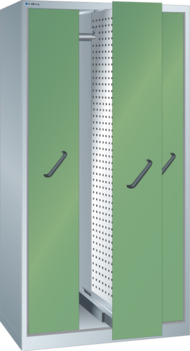 "longDescription": "LISTA Vertikalauszugschrank, BxTxH: 1000x695x1950mm, Anzahl Auszüge: 3 (200kg) inkl. Lochwände mit 4-kant Lochung 10x10mm, Teilung 38mm, Ausstattung: mit Frontblenden und Lochwänden HxT 1700x612mm, beidseitig nutzbar, Schliessart: Key Lock, Standard-Schliessung mit Wechselzylinder inkl. 2 Schlüsseln mit Schlüsselnummer, Farbe Gehäuse: Lichtgrau RAL 7035, Farbe Fronten/Türen: Resedagrün RAL 6011. Höchste Stabilität durch eine Gehäusetragkraft bis 1000 kg. Hohe Traglasten: Vertikalauszüge bis 200 kg belastbar. Perfekte Laufruhe selbst bei hohem Gewicht durch Vollauszug auf leichtgängigen Kunststoffrollen. Überzeugende Sicherheit durch Einzelschubladensperre als Kippschutz. Sichere Verschliessbarkeit dank Frontblenden oder Flügeltüren mit Key Lock inkl. Wechselzylinder oder elektronischem Zahlenschloss Code Lock. Flexible Ausstattungsmöglichkeiten mit Verstellböden, Lochwänden und Böden für Werkzeughalter zur NC-Lagerung im 50-mm-Raster. Höchster Bedienkomfort durch direkten, beidseitigen Zugang zu den Werkzeugen und Kleinteilen. Exzellente Schutzeigenschaften gegen Schmutz, Flüssigkeiten und mechanische Beanspruchung durch geschlossenes Gehäuse mit schlag- und abriebfester Oberfläche<br>",