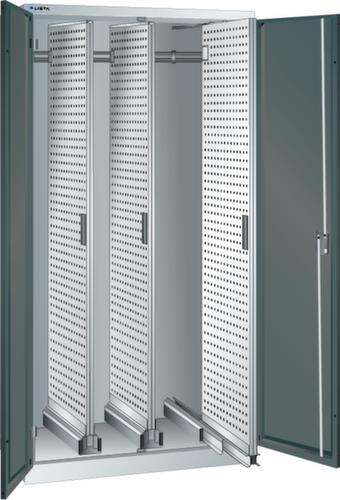 "longDescription": "LISTA Vertikalauszugschrank, BxTxH: 1000x600x1950mm, Anzahl Auszüge: 3 (200kg) inkl. Lochwände mit 4-kant Lochung 10x10mm, Teilung 38mm, Ausstattung: mit Flügeltüren, Türlagerung in Scharnieren, Öffnungswinkel 115 Grad, Lochwände HxT 1700x560mm, beidseitig nutzbar, Schliessart: Key Lock, Standard-Schliessung mit Wechselzylinder inkl. 2 Schlüsseln mit Schlüsselnummer, Farbe Gehäuse: Lichtgrau RAL 7035, Farbe Fronten/Türen: Schwarz NCS S 9000-N. Höchste Stabilität durch eine Gehäusetragkraft bis 1000 kg. Hohe Traglasten: Vertikalauszüge bis 200 kg belastbar. Perfekte Laufruhe selbst bei hohem Gewicht durch Vollauszug auf leichtgängigen Kunststoffrollen. Überzeugende Sicherheit durch Einzelschubladensperre als Kippschutz. Sichere Verschliessbarkeit dank Frontblenden oder Flügeltüren mit Key Lock inkl. Wechselzylinder oder elektronischem Zahlenschloss Code Lock. Flexible Ausstattungsmöglichkeiten mit Verstellböden, Lochwänden und Böden für Werkzeughalter zur NC-Lagerung im 50-mm-Raster. Höchster Bedienkomfort durch direkten, beidseitigen Zugang zu den Werkzeugen und Kleinteilen. Exzellente Schutzeigenschaften gegen Schmutz, Flüssigkeiten und mechanische Beanspruchung durch geschlossenes Gehäuse mit schlag- und abriebfester Oberfläche<br>",