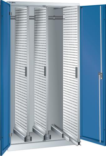 "longDescription": "LISTA Vertikalauszugschrank, BxTxH: 1000x600x1950mm, Anzahl Auszüge: 3 (200kg) inkl. Lochwände mit 4-kant Lochung 10x10mm, Teilung 38mm, Ausstattung: mit Flügeltüren, Türlagerung in Scharnieren, Öffnungswinkel 115 Grad, Lochwände HxT 1700x560mm, beidseitig nutzbar, Schliessart: Key Lock, Standard-Schliessung mit Wechselzylinder inkl. 2 Schlüsseln mit Schlüsselnummer, Farbe Gehäuse: Lichtgrau RAL 7035, Farbe Fronten/Türen: Enzianblau RAL 5010. Höchste Stabilität durch eine Gehäusetragkraft bis 1000 kg. Hohe Traglasten: Vertikalauszüge bis 200 kg belastbar. Perfekte Laufruhe selbst bei hohem Gewicht durch Vollauszug auf leichtgängigen Kunststoffrollen. Überzeugende Sicherheit durch Einzelschubladensperre als Kippschutz. Sichere Verschliessbarkeit dank Frontblenden oder Flügeltüren mit Key Lock inkl. Wechselzylinder oder elektronischem Zahlenschloss Code Lock. Flexible Ausstattungsmöglichkeiten mit Verstellböden, Lochwänden und Böden für Werkzeughalter zur NC-Lagerung im 50-mm-Raster. Höchster Bedienkomfort durch direkten, beidseitigen Zugang zu den Werkzeugen und Kleinteilen. Exzellente Schutzeigenschaften gegen Schmutz, Flüssigkeiten und mechanische Beanspruchung durch geschlossenes Gehäuse mit schlag- und abriebfester Oberfläche<br>",