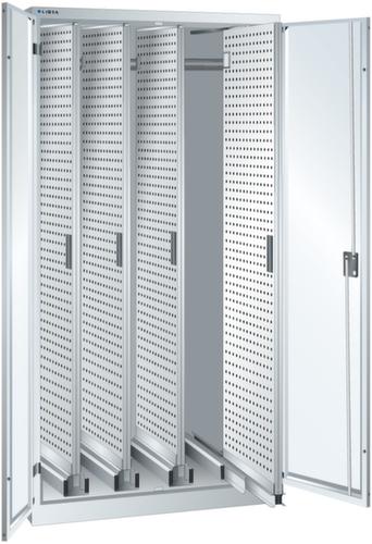 "longDescription": "LISTA Vertikalauszugschrank, BxTxH: 1000x600x1950mm, Anzahl Auszüge: 4 (200kg) inkl. Lochwände mit 4-kant Lochung 10x10mm, Teilung 38mm, Ausstattung: mit Flügeltüren, Türlagerung in Scharnieren, Öffnungswinkel 115 Grad, Lochwände HxT 1700x560mm, beidseitig nutzbar, Schliessart: Key Lock, Standard-Schliessung mit Wechselzylinder inkl. 2 Schlüsseln mit Schlüsselnummer, Farbe Gehäuse: Lichtgrau RAL 7035, Farbe Fronten/Türen: Reinweiss RAL 9010. Höchste Stabilität durch eine Gehäusetragkraft bis 1000 kg. Hohe Traglasten: Vertikalauszüge bis 200 kg belastbar. Perfekte Laufruhe selbst bei hohem Gewicht durch Vollauszug auf leichtgängigen Kunststoffrollen. Überzeugende Sicherheit durch Einzelschubladensperre als Kippschutz. Sichere Verschliessbarkeit dank Frontblenden oder Flügeltüren mit Key Lock inkl. Wechselzylinder oder elektronischem Zahlenschloss Code Lock. Flexible Ausstattungsmöglichkeiten mit Verstellböden, Lochwänden und Böden für Werkzeughalter zur NC-Lagerung im 50-mm-Raster. Höchster Bedienkomfort durch direkten, beidseitigen Zugang zu den Werkzeugen und Kleinteilen. Exzellente Schutzeigenschaften gegen Schmutz, Flüssigkeiten und mechanische Beanspruchung durch geschlossenes Gehäuse mit schlag- und abriebfester Oberfläche<br>",