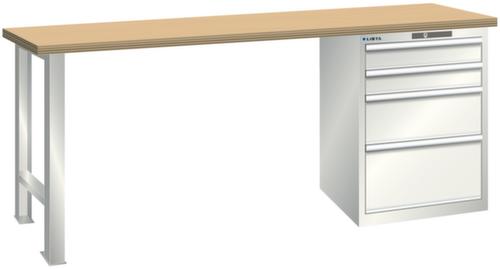 "longDescription": "LISTA Werkbank, Lista Einheit: 27x27E, BxTxH: 2000x700x840mm, Material: Multiplex, Stärke 40mm, inkl. Vormontage und Befestigungsmaterial, Max. Belastung: 800kg, Anzahl Schubladen: 4, Anzahl Fronthöhen (Tragkraft): 2x100mm (75kg), 1x200mm (75kg), 1x300mm (75kg), Schubladen-Nutzfläche BxT: 459x459mm, Schliessart: Code Lock, elektronisches Zahlenschloss mit 10 Ziffern für 4- bis 6-stellige Codes, bis 100 Codes, Farbe Gehäuse/Füsse: Grauweiss RAL 9002, Farbe Schubladen: Grauweiss RAL 9002. Hohe Ausführungsvielfalt dank verschiedener Komponenten, Unterbauten, Materialien und Oberflächen. Jederzeit anpassbar an neue Arbeitsumgebungen durch den flexiblen Ein- und Umbau sämtlicher Komponenten im Baukastensystem. Schnelle und einfache Montage dank Werkbankplatten mit Vorbohrungen inkl. Hülsen zur Befestigung sämtlicher Unterbauten und Schubladenschränke. Allgemeine Vorteile der LISTA-Schubladenschränke<br>",