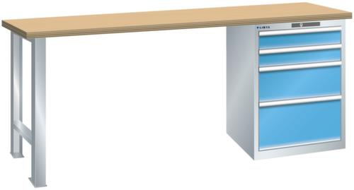 "longDescription": "LISTA Werkbank, Lista Einheit: 27x36E, BxTxH: 2000x800x850mm, Material: Buche, Stärke 50mm, inkl. Vormontage und Befestigungsmaterial, Max. Belastung: 1000kg, Anzahl Schubladen: 4, Anzahl Fronthöhen (Tragkraft): 2x100mm (75kg), 1x200mm (75kg), 1x300mm (75kg), Schubladen-Nutzfläche BxT: 459x612mm, Schliessart: Code Lock, elektronisches Zahlenschloss mit 10 Ziffern für 4- bis 6-stellige Codes, bis 100 Codes, Farbe Gehäuse/Füsse: Lichtgrau RAL 7035, Farbe Schubladen: Lichtblau RAL 5012. Hohe Ausführungsvielfalt dank verschiedener Komponenten, Unterbauten, Materialien und Oberflächen. Jederzeit anpassbar an neue Arbeitsumgebungen durch den flexiblen Ein- und Umbau sämtlicher Komponenten im Baukastensystem. Schnelle und einfache Montage dank Werkbankplatten mit Vorbohrungen inkl. Hülsen zur Befestigung sämtlicher Unterbauten und Schubladenschränke. Allgemeine Vorteile der LISTA-Schubladenschränke<br>",