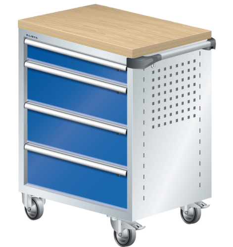 "longDescription": "LISTA Werkstattwagen, Lista Einheit: 36x27E, BxTxH: 894x525x928mm, Schubladen-Nutzfläche BxT: 612x459mm, Anzahl Schubladen: 4, Anzahl Fronthöhen (Tragkraft): 1x100mm (40kg), 3x200mm (40kg), Schliessart: Key Lock, Standard-Schliessung mit Wechselyzlinder inkl. 2 Schlüsseln mit Schlüsselnummer, Ausstattung: Mit Holzabdeckung aus Multiplex 40mm stark inkl. Einzelsicherung rechts, 1 Schiebestange, 2 Bockrollen und 2 Lenkrollen inkl. Feststeller aus Vollgummi mit Ø 100mm, Farbe Gehäuse: Lichtgrau RAL 7035, Farbe Schubladen: Signalblau RAL 5005. Optimale Traglasten: 40 kg pro Schublade, 400 kg Gehäuse-Tragkraft. Maximale Ausnutzung dank Vollauszug und optimaler Mantelhöhe der Schubladen. Perfekte Arbeitssicherheit: Zentralverschluss und Schubladeneinzel- bzw. Doppelsicherung gegen ungewolltes Öffnen im Fahrbetrieb. Flexible Anpassungsmöglichkeiten durch gelochte Seitenwand und Rückwand für die Aufnahme von Zubehör und Werkzeughaken. Höchster Bedienkomfort mit stabiler, ergonomischer Schiebestange. Volle Mobilität dank je zwei leichtgängiger Bock- und Lenkrollen aus Vollgummi. Zusätzliche Ablage- und Arbeitsfläche durch widerstandsfähige Holzabdeckung oder rutschfeste Kunststoffabdeckung mit Kleinteilefächern. Volle Kompatibilität mit LISTA Einteilungsmaterial durch einheitliches Mass<br>",