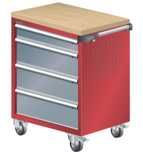 "longDescription": "LISTA Werkstattwagen, Lista Einheit: 36x27E, BxTxH: 894x525x928mm, Schubladen-Nutzfläche BxT: 612x459mm, Anzahl Schubladen: 4, Anzahl Fronthöhen (Tragkraft): 1x100mm (40kg), 3x200mm (40kg), Schliessart: Key Lock, Standard-Schliessung mit Wechselyzlinder inkl. 2 Schlüsseln mit Schlüsselnummer, Ausstattung: Mit Holzabdeckung aus Multiplex 40mm stark inkl. Einzelsicherung rechts, 1 Schiebestange, 2 Bockrollen und 2 Lenkrollen inkl. Feststeller aus Vollgummi mit Ø 100mm, Farbe Gehäuse: Rubinrot RAL 3003, Farbe Schubladen: Grau metallic NCS S 6502-B. Optimale Traglasten: 40 kg pro Schublade, 400 kg Gehäuse-Tragkraft. Maximale Ausnutzung dank Vollauszug und optimaler Mantelhöhe der Schubladen. Perfekte Arbeitssicherheit: Zentralverschluss und Schubladeneinzel- bzw. Doppelsicherung gegen ungewolltes Öffnen im Fahrbetrieb. Flexible Anpassungsmöglichkeiten durch gelochte Seitenwand und Rückwand für die Aufnahme von Zubehör und Werkzeughaken. Höchster Bedienkomfort mit stabiler, ergonomischer Schiebestange. Volle Mobilität dank je zwei leichtgängiger Bock- und Lenkrollen aus Vollgummi. Zusätzliche Ablage- und Arbeitsfläche durch widerstandsfähige Holzabdeckung oder rutschfeste Kunststoffabdeckung mit Kleinteilefächern. Volle Kompatibilität mit LISTA Einteilungsmaterial durch einheitliches Mass<br>",