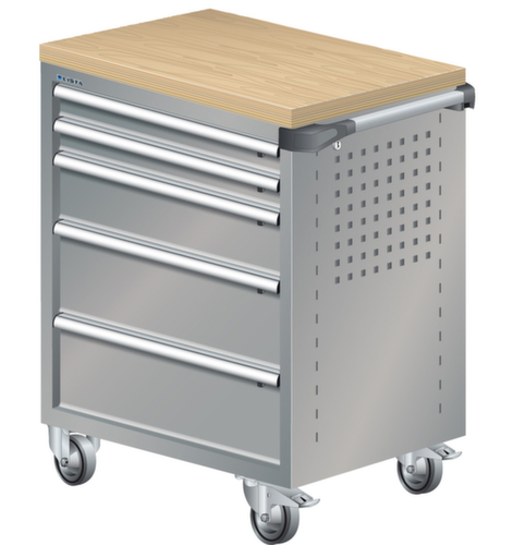 "longDescription": "LISTA Werkstattwagen, Lista Einheit: 36x27E, BxTxH: 894x525x928mm, Schubladen-Nutzfläche BxT: 612x459mm, Anzahl Schubladen: 5, Anzahl Fronthöhen (Tragkraft): 2x75mm (40kg), 1x150mm (40kg), 2x200mm (40kg), Schliessart: Key Lock, Standard-Schliessung mit Wechselyzlinder inkl. 2 Schlüsseln mit Schlüsselnummer, Ausstattung: Mit Holzabdeckung aus Multiplex 40mm stark inkl. Einzelsicherung rechts, 1 Schiebestange, 2 Bockrollen und 2 Lenkrollen inkl. Feststeller aus Vollgummi mit Ø 100mm, Farbe Gehäuse: Taubengrau NCS S 4502-B, Farbe Schubladen: Taubengrau NCS S 4502-B. Optimale Traglasten: 40 kg pro Schublade, 400 kg Gehäuse-Tragkraft. Maximale Ausnutzung dank Vollauszug und optimaler Mantelhöhe der Schubladen. Perfekte Arbeitssicherheit: Zentralverschluss und Schubladeneinzel- bzw. Doppelsicherung gegen ungewolltes Öffnen im Fahrbetrieb. Flexible Anpassungsmöglichkeiten durch gelochte Seitenwand und Rückwand für die Aufnahme von Zubehör und Werkzeughaken. Höchster Bedienkomfort mit stabiler, ergonomischer Schiebestange. Volle Mobilität dank je zwei leichtgängiger Bock- und Lenkrollen aus Vollgummi. Zusätzliche Ablage- und Arbeitsfläche durch widerstandsfähige Holzabdeckung oder rutschfeste Kunststoffabdeckung mit Kleinteilefächern. Volle Kompatibilität mit LISTA Einteilungsmaterial durch einheitliches Mass<br>",