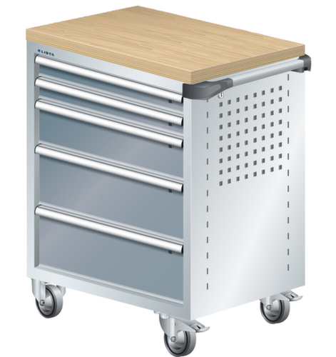 "longDescription": "LISTA Werkstattwagen, Lista Einheit: 36x27E, BxTxH: 894x525x928mm, Schubladen-Nutzfläche BxT: 612x459mm, Anzahl Schubladen: 5, Anzahl Fronthöhen (Tragkraft): 2x75mm (40kg), 1x150mm (40kg), 2x200mm (40kg), Schliessart: Key Lock, Standard-Schliessung mit Wechselyzlinder inkl. 2 Schlüsseln mit Schlüsselnummer, Ausstattung: Mit Holzabdeckung aus Multiplex 40mm stark inkl. Einzelsicherung rechts, 1 Schiebestange, 2 Bockrollen und 2 Lenkrollen inkl. Feststeller aus Vollgummi mit Ø 100mm, Farbe Gehäuse: Lichtgrau RAL 7035, Farbe Schubladen: Grau metallic NCS S 6502-B. Optimale Traglasten: 40 kg pro Schublade, 400 kg Gehäuse-Tragkraft. Maximale Ausnutzung dank Vollauszug und optimaler Mantelhöhe der Schubladen. Perfekte Arbeitssicherheit: Zentralverschluss und Schubladeneinzel- bzw. Doppelsicherung gegen ungewolltes Öffnen im Fahrbetrieb. Flexible Anpassungsmöglichkeiten durch gelochte Seitenwand und Rückwand für die Aufnahme von Zubehör und Werkzeughaken. Höchster Bedienkomfort mit stabiler, ergonomischer Schiebestange. Volle Mobilität dank je zwei leichtgängiger Bock- und Lenkrollen aus Vollgummi. Zusätzliche Ablage- und Arbeitsfläche durch widerstandsfähige Holzabdeckung oder rutschfeste Kunststoffabdeckung mit Kleinteilefächern. Volle Kompatibilität mit LISTA Einteilungsmaterial durch einheitliches Mass<br>",