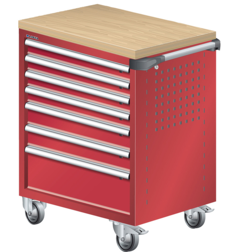 "longDescription": "LISTA Werkstattwagen, Lista Einheit: 36x27E, BxTxH: 894x525x928mm, Schubladen-Nutzfläche BxT: 612x459mm, Anzahl Schubladen: 7, Anzahl Fronthöhen (Tragkraft): 4x75mm (40kg), 2x100mm (40kg), 1x200mm (40kg), Schliessart: Key Lock, Standard-Schliessung mit Wechselyzlinder inkl. 2 Schlüsseln mit Schlüsselnummer, Ausstattung: Mit Holzabdeckung aus Multiplex 40mm stark inkl. Einzelsicherung rechts, 1 Schiebestange, 2 Bockrollen und 2 Lenkrollen inkl. Feststeller aus Vollgummi mit Ø 100mm, Farbe Gehäuse: Rubinrot RAL 3003, Farbe Schubladen: Rubinrot RAL 3003. Optimale Traglasten: 40 kg pro Schublade, 400 kg Gehäuse-Tragkraft. Maximale Ausnutzung dank Vollauszug und optimaler Mantelhöhe der Schubladen. Perfekte Arbeitssicherheit: Zentralverschluss und Schubladeneinzel- bzw. Doppelsicherung gegen ungewolltes Öffnen im Fahrbetrieb. Flexible Anpassungsmöglichkeiten durch gelochte Seitenwand und Rückwand für die Aufnahme von Zubehör und Werkzeughaken. Höchster Bedienkomfort mit stabiler, ergonomischer Schiebestange. Volle Mobilität dank je zwei leichtgängiger Bock- und Lenkrollen aus Vollgummi. Zusätzliche Ablage- und Arbeitsfläche durch widerstandsfähige Holzabdeckung oder rutschfeste Kunststoffabdeckung mit Kleinteilefächern. Volle Kompatibilität mit LISTA Einteilungsmaterial durch einheitliches Mass<br>",