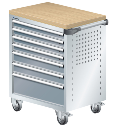 "longDescription": "LISTA Werkstattwagen, Lista Einheit: 36x27E, BxTxH: 894x525x928mm, Schubladen-Nutzfläche BxT: 612x459mm, Anzahl Schubladen: 7, Anzahl Fronthöhen (Tragkraft): 4x75mm (40kg), 2x100mm (40kg), 1x200mm (40kg), Schliessart: Key Lock, Standard-Schliessung mit Wechselyzlinder inkl. 2 Schlüsseln mit Schlüsselnummer, Ausstattung: Mit Holzabdeckung aus Multiplex 40mm stark inkl. Einzelsicherung rechts, 1 Schiebestange, 2 Bockrollen und 2 Lenkrollen inkl. Feststeller aus Vollgummi mit Ø 100mm, Farbe Gehäuse: Lichtgrau RAL 7035, Farbe Schubladen: Grau metallic NCS S 6502-B. Optimale Traglasten: 40 kg pro Schublade, 400 kg Gehäuse-Tragkraft. Maximale Ausnutzung dank Vollauszug und optimaler Mantelhöhe der Schubladen. Perfekte Arbeitssicherheit: Zentralverschluss und Schubladeneinzel- bzw. Doppelsicherung gegen ungewolltes Öffnen im Fahrbetrieb. Flexible Anpassungsmöglichkeiten durch gelochte Seitenwand und Rückwand für die Aufnahme von Zubehör und Werkzeughaken. Höchster Bedienkomfort mit stabiler, ergonomischer Schiebestange. Volle Mobilität dank je zwei leichtgängiger Bock- und Lenkrollen aus Vollgummi. Zusätzliche Ablage- und Arbeitsfläche durch widerstandsfähige Holzabdeckung oder rutschfeste Kunststoffabdeckung mit Kleinteilefächern. Volle Kompatibilität mit LISTA Einteilungsmaterial durch einheitliches Mass<br>",