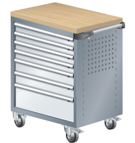 "longDescription": "LISTA Werkstattwagen, Lista Einheit: 36x27E, BxTxH: 894x525x928mm, Schubladen-Nutzfläche BxT: 612x459mm, Anzahl Schubladen: 7, Anzahl Fronthöhen (Tragkraft): 4x75mm (40kg), 2x100mm (40kg), 1x200mm (40kg), Schliessart: Key Lock, Standard-Schliessung mit Wechselyzlinder inkl. 2 Schlüsseln mit Schlüsselnummer, Ausstattung: Mit Holzabdeckung aus Multiplex 40mm stark inkl. Einzelsicherung rechts, 1 Schiebestange, 2 Bockrollen und 2 Lenkrollen inkl. Feststeller aus Vollgummi mit Ø 100mm, Farbe Gehäuse: Grau metallic NCS S 6502-B, Farbe Schubladen: Lichtgrau RAL 7035. Optimale Traglasten: 40 kg pro Schublade, 400 kg Gehäuse-Tragkraft. Maximale Ausnutzung dank Vollauszug und optimaler Mantelhöhe der Schubladen. Perfekte Arbeitssicherheit: Zentralverschluss und Schubladeneinzel- bzw. Doppelsicherung gegen ungewolltes Öffnen im Fahrbetrieb. Flexible Anpassungsmöglichkeiten durch gelochte Seitenwand und Rückwand für die Aufnahme von Zubehör und Werkzeughaken. Höchster Bedienkomfort mit stabiler, ergonomischer Schiebestange. Volle Mobilität dank je zwei leichtgängiger Bock- und Lenkrollen aus Vollgummi. Zusätzliche Ablage- und Arbeitsfläche durch widerstandsfähige Holzabdeckung oder rutschfeste Kunststoffabdeckung mit Kleinteilefächern. Volle Kompatibilität mit LISTA Einteilungsmaterial durch einheitliches Mass<br>",
