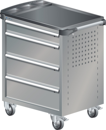 "longDescription": "LISTA Werkstattwagen, Lista Einheit: 36x27E, BxTxH: 894x525x928mm, Schubladen-Nutzfläche BxT: 612x459mm, Anzahl Schubladen: 4, Anzahl Fronthöhen (Tragkraft): 1x100mm (40kg), 3x200mm (40kg), Schliessart: Key Lock, Standard-Schliessung mit Wechselyzlinder inkl. 2 Schlüsseln mit Schlüsselnummer, Ausstattung: Mit Kunststoffabdeckung inkl. Einzelsicherung rechts, 1 Schiebestange, 2 Bockrollen und 2 Lenkrollen inkl. Feststeller aus Vollgummi mit Ø 100mm, Farbe Gehäuse: Taubengrau NCS S 4502-B, Farbe Schubladen: Taubengrau NCS S 4502-B. Optimale Traglasten: 40 kg pro Schublade, 400 kg Gehäuse-Tragkraft. Maximale Ausnutzung dank Vollauszug und optimaler Mantelhöhe der Schubladen. Perfekte Arbeitssicherheit: Zentralverschluss und Schubladeneinzel- bzw. Doppelsicherung gegen ungewolltes Öffnen im Fahrbetrieb. Flexible Anpassungsmöglichkeiten durch gelochte Seitenwand und Rückwand für die Aufnahme von Zubehör und Werkzeughaken. Höchster Bedienkomfort mit stabiler, ergonomischer Schiebestange. Volle Mobilität dank je zwei leichtgängiger Bock- und Lenkrollen aus Vollgummi. Zusätzliche Ablage- und Arbeitsfläche durch widerstandsfähige Holzabdeckung oder rutschfeste Kunststoffabdeckung mit Kleinteilefächern. Volle Kompatibilität mit LISTA Einteilungsmaterial durch einheitliches Mass<br>",