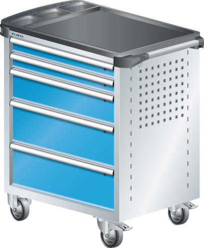 "longDescription": "LISTA Werkstattwagen, Lista Einheit: 36x27E, BxTxH: 894x525x928mm, Schubladen-Nutzfläche BxT: 612x459mm, Anzahl Schubladen: 5, Anzahl Fronthöhen (Tragkraft): 2x75mm (40kg), 1x150mm (40kg), 2x200mm (40kg), Schliessart: Key Lock, Standard-Schliessung mit Wechselyzlinder inkl. 2 Schlüsseln mit Schlüsselnummer, Ausstattung: Mit Kunststoffabdeckung inkl. Einzelsicherung rechts, 1 Schiebestange, 2 Bockrollen und 2 Lenkrollen inkl. Feststeller aus Vollgummi mit Ø 100mm, Farbe Gehäuse: Lichtgrau RAL 7035, Farbe Schubladen: Lichtblau RAL 5012. Optimale Traglasten: 40 kg pro Schublade, 400 kg Gehäuse-Tragkraft. Maximale Ausnutzung dank Vollauszug und optimaler Mantelhöhe der Schubladen. Perfekte Arbeitssicherheit: Zentralverschluss und Schubladeneinzel- bzw. Doppelsicherung gegen ungewolltes Öffnen im Fahrbetrieb. Flexible Anpassungsmöglichkeiten durch gelochte Seitenwand und Rückwand für die Aufnahme von Zubehör und Werkzeughaken. Höchster Bedienkomfort mit stabiler, ergonomischer Schiebestange. Volle Mobilität dank je zwei leichtgängiger Bock- und Lenkrollen aus Vollgummi. Zusätzliche Ablage- und Arbeitsfläche durch widerstandsfähige Holzabdeckung oder rutschfeste Kunststoffabdeckung mit Kleinteilefächern. Volle Kompatibilität mit LISTA Einteilungsmaterial durch einheitliches Mass<br>",