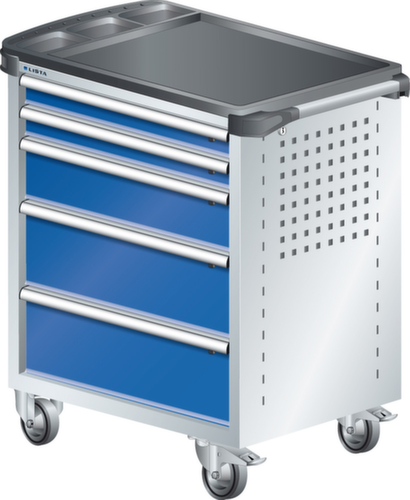 "longDescription": "LISTA Werkstattwagen, Lista Einheit: 36x27E, BxTxH: 894x525x928mm, Schubladen-Nutzfläche BxT: 612x459mm, Anzahl Schubladen: 5, Anzahl Fronthöhen (Tragkraft): 2x75mm (40kg), 1x150mm (40kg), 2x200mm (40kg), Schliessart: Key Lock, Standard-Schliessung mit Wechselyzlinder inkl. 2 Schlüsseln mit Schlüsselnummer, Ausstattung: Mit Kunststoffabdeckung inkl. Einzelsicherung rechts, 1 Schiebestange, 2 Bockrollen und 2 Lenkrollen inkl. Feststeller aus Vollgummi mit Ø 100mm, Farbe Gehäuse: Lichtgrau RAL 7035, Farbe Schubladen: Signalblau RAL 5005. Optimale Traglasten: 40 kg pro Schublade, 400 kg Gehäuse-Tragkraft. Maximale Ausnutzung dank Vollauszug und optimaler Mantelhöhe der Schubladen. Perfekte Arbeitssicherheit: Zentralverschluss und Schubladeneinzel- bzw. Doppelsicherung gegen ungewolltes Öffnen im Fahrbetrieb. Flexible Anpassungsmöglichkeiten durch gelochte Seitenwand und Rückwand für die Aufnahme von Zubehör und Werkzeughaken. Höchster Bedienkomfort mit stabiler, ergonomischer Schiebestange. Volle Mobilität dank je zwei leichtgängiger Bock- und Lenkrollen aus Vollgummi. Zusätzliche Ablage- und Arbeitsfläche durch widerstandsfähige Holzabdeckung oder rutschfeste Kunststoffabdeckung mit Kleinteilefächern. Volle Kompatibilität mit LISTA Einteilungsmaterial durch einheitliches Mass<br>",