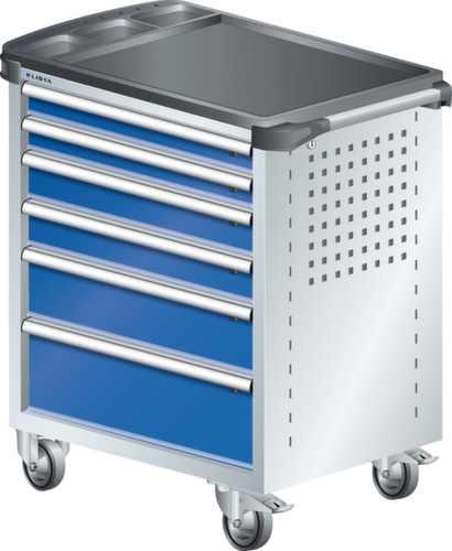 "longDescription": "LISTA Werkstattwagen, Lista Einheit: 36x27E, BxTxH: 894x525x928mm, Schubladen-Nutzfläche BxT: 612x459mm, Anzahl Schubladen: 6, Anzahl Fronthöhen (Tragkraft): 2x75mm (40kg), 2x100mm (40kg), 1x150mm (40kg), 1x200mm (40kg), Schliessart: Key Lock, Standard-Schliessung mit Wechselyzlinder inkl. 2 Schlüsseln mit Schlüsselnummer, Ausstattung: Mit Kunststoffabdeckung inkl. Einzelsicherung rechts, 1 Schiebestange, 2 Bockrollen und 2 Lenkrollen inkl. Feststeller aus Vollgummi mit Ø 100mm, Farbe Gehäuse: Lichtgrau RAL 7035, Farbe Schubladen: Signalblau RAL 5005. Optimale Traglasten: 40 kg pro Schublade, 400 kg Gehäuse-Tragkraft. Maximale Ausnutzung dank Vollauszug und optimaler Mantelhöhe der Schubladen. Perfekte Arbeitssicherheit: Zentralverschluss und Schubladeneinzel- bzw. Doppelsicherung gegen ungewolltes Öffnen im Fahrbetrieb. Flexible Anpassungsmöglichkeiten durch gelochte Seitenwand und Rückwand für die Aufnahme von Zubehör und Werkzeughaken. Höchster Bedienkomfort mit stabiler, ergonomischer Schiebestange. Volle Mobilität dank je zwei leichtgängiger Bock- und Lenkrollen aus Vollgummi. Zusätzliche Ablage- und Arbeitsfläche durch widerstandsfähige Holzabdeckung oder rutschfeste Kunststoffabdeckung mit Kleinteilefächern. Volle Kompatibilität mit LISTA Einteilungsmaterial durch einheitliches Mass<br>",