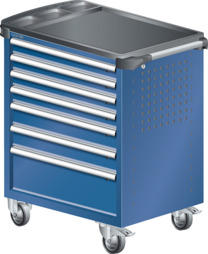 "longDescription": "LISTA Werkstattwagen, Lista Einheit: 36x27E, BxTxH: 894x525x928mm, Schubladen-Nutzfläche BxT: 612x459mm, Anzahl Schubladen: 7, Anzahl Fronthöhen (Tragkraft): 4x75mm (40kg), 2x100mm (40kg), 1x200mm (40kg), Schliessart: Key Lock, Standard-Schliessung mit Wechselyzlinder inkl. 2 Schlüsseln mit Schlüsselnummer, Ausstattung: Mit Kunststoffabdeckung inkl. Einzelsicherung rechts, 1 Schiebestange, 2 Bockrollen und 2 Lenkrollen inkl. Feststeller aus Vollgummi mit Ø 100mm, Farbe Gehäuse: Enzianblau RAL 5010, Farbe Schubladen: Enzianblau RAL 5010. Optimale Traglasten: 40 kg pro Schublade, 400 kg Gehäuse-Tragkraft. Maximale Ausnutzung dank Vollauszug und optimaler Mantelhöhe der Schubladen. Perfekte Arbeitssicherheit: Zentralverschluss und Schubladeneinzel- bzw. Doppelsicherung gegen ungewolltes Öffnen im Fahrbetrieb. Flexible Anpassungsmöglichkeiten durch gelochte Seitenwand und Rückwand für die Aufnahme von Zubehör und Werkzeughaken. Höchster Bedienkomfort mit stabiler, ergonomischer Schiebestange. Volle Mobilität dank je zwei leichtgängiger Bock- und Lenkrollen aus Vollgummi. Zusätzliche Ablage- und Arbeitsfläche durch widerstandsfähige Holzabdeckung oder rutschfeste Kunststoffabdeckung mit Kleinteilefächern. Volle Kompatibilität mit LISTA Einteilungsmaterial durch einheitliches Mass<br>",