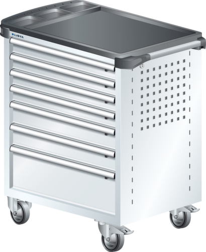 "longDescription": "LISTA Werkstattwagen, Lista Einheit: 36x27E, BxTxH: 894x525x928mm, Schubladen-Nutzfläche BxT: 612x459mm, Anzahl Schubladen: 7, Anzahl Fronthöhen (Tragkraft): 4x75mm (40kg), 2x100mm (40kg), 1x200mm (40kg), Schliessart: Key Lock, Standard-Schliessung mit Wechselyzlinder inkl. 2 Schlüsseln mit Schlüsselnummer, Ausstattung: Mit Kunststoffabdeckung inkl. Einzelsicherung rechts, 1 Schiebestange, 2 Bockrollen und 2 Lenkrollen inkl. Feststeller aus Vollgummi mit Ø 100mm, Farbe Gehäuse: Reinweiss RAL 9010, Farbe Schubladen: Reinweiss RAL 9010. Optimale Traglasten: 40 kg pro Schublade, 400 kg Gehäuse-Tragkraft. Maximale Ausnutzung dank Vollauszug und optimaler Mantelhöhe der Schubladen. Perfekte Arbeitssicherheit: Zentralverschluss und Schubladeneinzel- bzw. Doppelsicherung gegen ungewolltes Öffnen im Fahrbetrieb. Flexible Anpassungsmöglichkeiten durch gelochte Seitenwand und Rückwand für die Aufnahme von Zubehör und Werkzeughaken. Höchster Bedienkomfort mit stabiler, ergonomischer Schiebestange. Volle Mobilität dank je zwei leichtgängiger Bock- und Lenkrollen aus Vollgummi. Zusätzliche Ablage- und Arbeitsfläche durch widerstandsfähige Holzabdeckung oder rutschfeste Kunststoffabdeckung mit Kleinteilefächern. Volle Kompatibilität mit LISTA Einteilungsmaterial durch einheitliches Mass<br>",