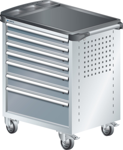 "longDescription": "LISTA Werkstattwagen, Lista Einheit: 36x27E, BxTxH: 894x525x928mm, Schubladen-Nutzfläche BxT: 612x459mm, Anzahl Schubladen: 7, Anzahl Fronthöhen (Tragkraft): 4x75mm (40kg), 2x100mm (40kg), 1x200mm (40kg), Schliessart: Key Lock, Standard-Schliessung mit Wechselyzlinder inkl. 2 Schlüsseln mit Schlüsselnummer, Ausstattung: Mit Kunststoffabdeckung inkl. Einzelsicherung rechts, 1 Schiebestange, 2 Bockrollen und 2 Lenkrollen inkl. Feststeller aus Vollgummi mit Ø 100mm, Farbe Gehäuse: Lichtgrau RAL 7035, Farbe Schubladen: Grau metallic NCS S 6502-B. Optimale Traglasten: 40 kg pro Schublade, 400 kg Gehäuse-Tragkraft. Maximale Ausnutzung dank Vollauszug und optimaler Mantelhöhe der Schubladen. Perfekte Arbeitssicherheit: Zentralverschluss und Schubladeneinzel- bzw. Doppelsicherung gegen ungewolltes Öffnen im Fahrbetrieb. Flexible Anpassungsmöglichkeiten durch gelochte Seitenwand und Rückwand für die Aufnahme von Zubehör und Werkzeughaken. Höchster Bedienkomfort mit stabiler, ergonomischer Schiebestange. Volle Mobilität dank je zwei leichtgängiger Bock- und Lenkrollen aus Vollgummi. Zusätzliche Ablage- und Arbeitsfläche durch widerstandsfähige Holzabdeckung oder rutschfeste Kunststoffabdeckung mit Kleinteilefächern. Volle Kompatibilität mit LISTA Einteilungsmaterial durch einheitliches Mass<br>",