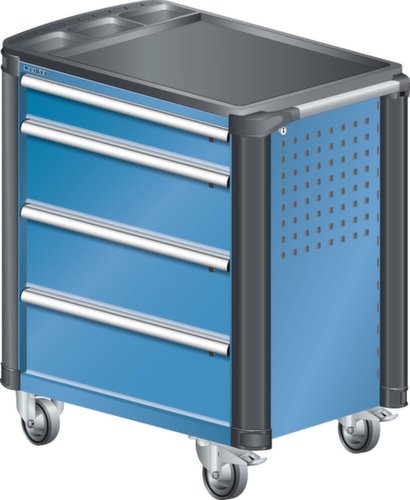 "longDescription": "LISTA Werkstattwagen, Lista Einheit: 36x27E, BxTxH: 894x525x928mm, Schubladen-Nutzfläche BxT: 612x459mm, Anzahl Schubladen: 4, Anzahl Fronthöhen (Tragkraft): 1x100mm (40kg), 3x200mm (40kg), Schliessart: Key Lock, Standard-Schliessung mit Wechselyzlinder inkl. 2 Schlüsseln mit Schlüsselnummer, Ausstattung: Mit Kunststoffabdeckung und Kantenschutz inkl. Einzelsicherung rechts, 1 Schiebestange, 2 Bockrollen und 2 Lenkrollen inkl. Feststeller aus Vollgummi mit Ø 100mm, Farbe Gehäuse: Capriblau RAL 5019, Farbe Schubladen: Capriblau RAL 5019. Optimale Traglasten: 40 kg pro Schublade, 400 kg Gehäuse-Tragkraft. Maximale Ausnutzung dank Vollauszug und optimaler Mantelhöhe der Schubladen. Perfekte Arbeitssicherheit: Zentralverschluss und Schubladeneinzel- bzw. Doppelsicherung gegen ungewolltes Öffnen im Fahrbetrieb. Flexible Anpassungsmöglichkeiten durch gelochte Seitenwand und Rückwand für die Aufnahme von Zubehör und Werkzeughaken. Höchster Bedienkomfort mit stabiler, ergonomischer Schiebestange. Volle Mobilität dank je zwei leichtgängiger Bock- und Lenkrollen aus Vollgummi. Zusätzliche Ablage- und Arbeitsfläche durch widerstandsfähige Holzabdeckung oder rutschfeste Kunststoffabdeckung mit Kleinteilefächern. Volle Kompatibilität mit LISTA Einteilungsmaterial durch einheitliches Mass<br>",
