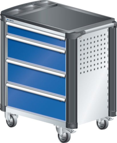 "longDescription": "LISTA Werkstattwagen, Lista Einheit: 36x27E, BxTxH: 894x525x928mm, Schubladen-Nutzfläche BxT: 612x459mm, Anzahl Schubladen: 4, Anzahl Fronthöhen (Tragkraft): 1x100mm (40kg), 3x200mm (40kg), Schliessart: Key Lock, Standard-Schliessung mit Wechselyzlinder inkl. 2 Schlüsseln mit Schlüsselnummer, Ausstattung: Mit Kunststoffabdeckung und Kantenschutz inkl. Einzelsicherung rechts, 1 Schiebestange, 2 Bockrollen und 2 Lenkrollen inkl. Feststeller aus Vollgummi mit Ø 100mm, Farbe Gehäuse: Lichtgrau RAL 7035, Farbe Schubladen: Signalblau RAL 5005. Optimale Traglasten: 40 kg pro Schublade, 400 kg Gehäuse-Tragkraft. Maximale Ausnutzung dank Vollauszug und optimaler Mantelhöhe der Schubladen. Perfekte Arbeitssicherheit: Zentralverschluss und Schubladeneinzel- bzw. Doppelsicherung gegen ungewolltes Öffnen im Fahrbetrieb. Flexible Anpassungsmöglichkeiten durch gelochte Seitenwand und Rückwand für die Aufnahme von Zubehör und Werkzeughaken. Höchster Bedienkomfort mit stabiler, ergonomischer Schiebestange. Volle Mobilität dank je zwei leichtgängiger Bock- und Lenkrollen aus Vollgummi. Zusätzliche Ablage- und Arbeitsfläche durch widerstandsfähige Holzabdeckung oder rutschfeste Kunststoffabdeckung mit Kleinteilefächern. Volle Kompatibilität mit LISTA Einteilungsmaterial durch einheitliches Mass<br>",