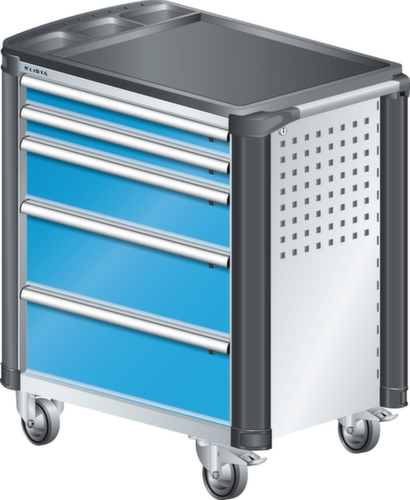 "longDescription": "LISTA Werkstattwagen, Lista Einheit: 36x27E, BxTxH: 894x525x928mm, Schubladen-Nutzfläche BxT: 612x459mm, Anzahl Schubladen: 5, Anzahl Fronthöhen (Tragkraft): 2x75mm (40kg), 1x150mm (40kg), 2x200mm (40kg), Schliessart: Key Lock, Standard-Schliessung mit Wechselyzlinder inkl. 2 Schlüsseln mit Schlüsselnummer, Ausstattung: Mit Kunststoffabdeckung und Kantenschutz inkl. Einzelsicherung rechts, 1 Schiebestange, 2 Bockrollen und 2 Lenkrollen inkl. Feststeller aus Vollgummi mit Ø 100mm, Farbe Gehäuse: Lichtgrau RAL 7035, Farbe Schubladen: Lichtblau RAL 5012. Optimale Traglasten: 40 kg pro Schublade, 400 kg Gehäuse-Tragkraft. Maximale Ausnutzung dank Vollauszug und optimaler Mantelhöhe der Schubladen. Perfekte Arbeitssicherheit: Zentralverschluss und Schubladeneinzel- bzw. Doppelsicherung gegen ungewolltes Öffnen im Fahrbetrieb. Flexible Anpassungsmöglichkeiten durch gelochte Seitenwand und Rückwand für die Aufnahme von Zubehör und Werkzeughaken. Höchster Bedienkomfort mit stabiler, ergonomischer Schiebestange. Volle Mobilität dank je zwei leichtgängiger Bock- und Lenkrollen aus Vollgummi. Zusätzliche Ablage- und Arbeitsfläche durch widerstandsfähige Holzabdeckung oder rutschfeste Kunststoffabdeckung mit Kleinteilefächern. Volle Kompatibilität mit LISTA Einteilungsmaterial durch einheitliches Mass<br>",