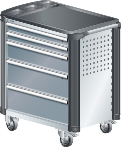 "longDescription": "LISTA Werkstattwagen, Lista Einheit: 36x27E, BxTxH: 894x525x928mm, Schubladen-Nutzfläche BxT: 612x459mm, Anzahl Schubladen: 5, Anzahl Fronthöhen (Tragkraft): 2x75mm (40kg), 1x150mm (40kg), 2x200mm (40kg), Schliessart: Key Lock, Standard-Schliessung mit Wechselyzlinder inkl. 2 Schlüsseln mit Schlüsselnummer, Ausstattung: Mit Kunststoffabdeckung und Kantenschutz inkl. Einzelsicherung rechts, 1 Schiebestange, 2 Bockrollen und 2 Lenkrollen inkl. Feststeller aus Vollgummi mit Ø 100mm, Farbe Gehäuse: Lichtgrau RAL 7035, Farbe Schubladen: Grau metallic NCS S 6502-B. Optimale Traglasten: 40 kg pro Schublade, 400 kg Gehäuse-Tragkraft. Maximale Ausnutzung dank Vollauszug und optimaler Mantelhöhe der Schubladen. Perfekte Arbeitssicherheit: Zentralverschluss und Schubladeneinzel- bzw. Doppelsicherung gegen ungewolltes Öffnen im Fahrbetrieb. Flexible Anpassungsmöglichkeiten durch gelochte Seitenwand und Rückwand für die Aufnahme von Zubehör und Werkzeughaken. Höchster Bedienkomfort mit stabiler, ergonomischer Schiebestange. Volle Mobilität dank je zwei leichtgängiger Bock- und Lenkrollen aus Vollgummi. Zusätzliche Ablage- und Arbeitsfläche durch widerstandsfähige Holzabdeckung oder rutschfeste Kunststoffabdeckung mit Kleinteilefächern. Volle Kompatibilität mit LISTA Einteilungsmaterial durch einheitliches Mass<br>",