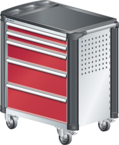 "longDescription": "LISTA Werkstattwagen, Lista Einheit: 36x27E, BxTxH: 894x525x928mm, Schubladen-Nutzfläche BxT: 612x459mm, Anzahl Schubladen: 5, Anzahl Fronthöhen (Tragkraft): 2x75mm (40kg), 1x150mm (40kg), 2x200mm (40kg), Schliessart: Key Lock, Standard-Schliessung mit Wechselyzlinder inkl. 2 Schlüsseln mit Schlüsselnummer, Ausstattung: Mit Kunststoffabdeckung und Kantenschutz inkl. Einzelsicherung rechts, 1 Schiebestange, 2 Bockrollen und 2 Lenkrollen inkl. Feststeller aus Vollgummi mit Ø 100mm, Farbe Gehäuse: Lichtgrau RAL 7035, Farbe Schubladen: Rubinrot RAL 3003. Optimale Traglasten: 40 kg pro Schublade, 400 kg Gehäuse-Tragkraft. Maximale Ausnutzung dank Vollauszug und optimaler Mantelhöhe der Schubladen. Perfekte Arbeitssicherheit: Zentralverschluss und Schubladeneinzel- bzw. Doppelsicherung gegen ungewolltes Öffnen im Fahrbetrieb. Flexible Anpassungsmöglichkeiten durch gelochte Seitenwand und Rückwand für die Aufnahme von Zubehör und Werkzeughaken. Höchster Bedienkomfort mit stabiler, ergonomischer Schiebestange. Volle Mobilität dank je zwei leichtgängiger Bock- und Lenkrollen aus Vollgummi. Zusätzliche Ablage- und Arbeitsfläche durch widerstandsfähige Holzabdeckung oder rutschfeste Kunststoffabdeckung mit Kleinteilefächern. Volle Kompatibilität mit LISTA Einteilungsmaterial durch einheitliches Mass<br>",
