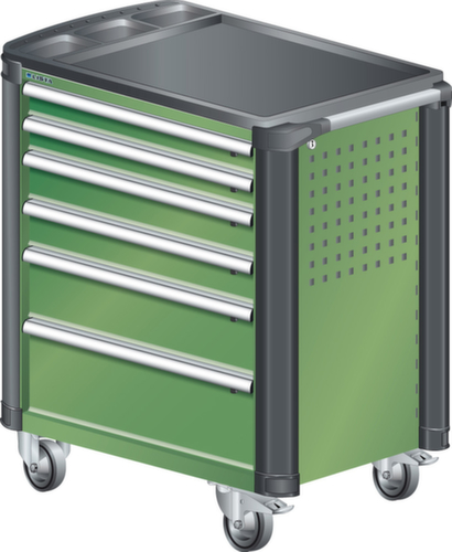 "longDescription": "LISTA Werkstattwagen, Lista Einheit: 36x27E, BxTxH: 894x525x928mm, Schubladen-Nutzfläche BxT: 612x459mm, Anzahl Schubladen: 6, Anzahl Fronthöhen (Tragkraft): 2x75mm (40kg), 2x100mm (40kg), 1x150mm (40kg), 1x200mm (40kg), Schliessart: Key Lock, Standard-Schliessung mit Wechselyzlinder inkl. 2 Schlüsseln mit Schlüsselnummer, Ausstattung: Mit Kunststoffabdeckung und Kantenschutz inkl. Einzelsicherung rechts, 1 Schiebestange, 2 Bockrollen und 2 Lenkrollen inkl. Feststeller aus Vollgummi mit Ø 100mm, Farbe Gehäuse: Resedagrün RAL 6011, Farbe Schubladen: Resedagrün RAL 6011. Optimale Traglasten: 40 kg pro Schublade, 400 kg Gehäuse-Tragkraft. Maximale Ausnutzung dank Vollauszug und optimaler Mantelhöhe der Schubladen. Perfekte Arbeitssicherheit: Zentralverschluss und Schubladeneinzel- bzw. Doppelsicherung gegen ungewolltes Öffnen im Fahrbetrieb. Flexible Anpassungsmöglichkeiten durch gelochte Seitenwand und Rückwand für die Aufnahme von Zubehör und Werkzeughaken. Höchster Bedienkomfort mit stabiler, ergonomischer Schiebestange. Volle Mobilität dank je zwei leichtgängiger Bock- und Lenkrollen aus Vollgummi. Zusätzliche Ablage- und Arbeitsfläche durch widerstandsfähige Holzabdeckung oder rutschfeste Kunststoffabdeckung mit Kleinteilefächern. Volle Kompatibilität mit LISTA Einteilungsmaterial durch einheitliches Mass<br>",