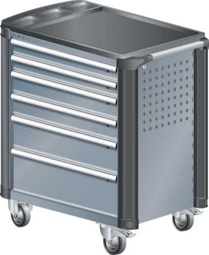 "longDescription": "LISTA Werkstattwagen, Lista Einheit: 36x27E, BxTxH: 894x525x928mm, Schubladen-Nutzfläche BxT: 612x459mm, Anzahl Schubladen: 6, Anzahl Fronthöhen (Tragkraft): 2x75mm (40kg), 2x100mm (40kg), 1x150mm (40kg), 1x200mm (40kg), Schliessart: Key Lock, Standard-Schliessung mit Wechselyzlinder inkl. 2 Schlüsseln mit Schlüsselnummer, Ausstattung: Mit Kunststoffabdeckung und Kantenschutz inkl. Einzelsicherung rechts, 1 Schiebestange, 2 Bockrollen und 2 Lenkrollen inkl. Feststeller aus Vollgummi mit Ø 100mm, Farbe Gehäuse: Grau metallic NCS S 6502-B, Farbe Schubladen: Grau metallic NCS S 6502-B. Optimale Traglasten: 40 kg pro Schublade, 400 kg Gehäuse-Tragkraft. Maximale Ausnutzung dank Vollauszug und optimaler Mantelhöhe der Schubladen. Perfekte Arbeitssicherheit: Zentralverschluss und Schubladeneinzel- bzw. Doppelsicherung gegen ungewolltes Öffnen im Fahrbetrieb. Flexible Anpassungsmöglichkeiten durch gelochte Seitenwand und Rückwand für die Aufnahme von Zubehör und Werkzeughaken. Höchster Bedienkomfort mit stabiler, ergonomischer Schiebestange. Volle Mobilität dank je zwei leichtgängiger Bock- und Lenkrollen aus Vollgummi. Zusätzliche Ablage- und Arbeitsfläche durch widerstandsfähige Holzabdeckung oder rutschfeste Kunststoffabdeckung mit Kleinteilefächern. Volle Kompatibilität mit LISTA Einteilungsmaterial durch einheitliches Mass<br>",