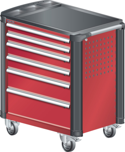 "longDescription": "LISTA Werkstattwagen, Lista Einheit: 36x27E, BxTxH: 894x525x928mm, Schubladen-Nutzfläche BxT: 612x459mm, Anzahl Schubladen: 6, Anzahl Fronthöhen (Tragkraft): 2x75mm (40kg), 2x100mm (40kg), 1x150mm (40kg), 1x200mm (40kg), Schliessart: Key Lock, Standard-Schliessung mit Wechselyzlinder inkl. 2 Schlüsseln mit Schlüsselnummer, Ausstattung: Mit Kunststoffabdeckung und Kantenschutz inkl. Einzelsicherung rechts, 1 Schiebestange, 2 Bockrollen und 2 Lenkrollen inkl. Feststeller aus Vollgummi mit Ø 100mm, Farbe Gehäuse: Rubinrot RAL 3003, Farbe Schubladen: Rubinrot RAL 3003. Optimale Traglasten: 40 kg pro Schublade, 400 kg Gehäuse-Tragkraft. Maximale Ausnutzung dank Vollauszug und optimaler Mantelhöhe der Schubladen. Perfekte Arbeitssicherheit: Zentralverschluss und Schubladeneinzel- bzw. Doppelsicherung gegen ungewolltes Öffnen im Fahrbetrieb. Flexible Anpassungsmöglichkeiten durch gelochte Seitenwand und Rückwand für die Aufnahme von Zubehör und Werkzeughaken. Höchster Bedienkomfort mit stabiler, ergonomischer Schiebestange. Volle Mobilität dank je zwei leichtgängiger Bock- und Lenkrollen aus Vollgummi. Zusätzliche Ablage- und Arbeitsfläche durch widerstandsfähige Holzabdeckung oder rutschfeste Kunststoffabdeckung mit Kleinteilefächern. Volle Kompatibilität mit LISTA Einteilungsmaterial durch einheitliches Mass<br>",