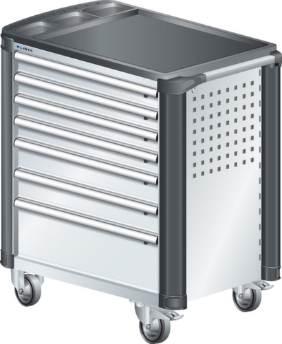 "longDescription": "LISTA Werkstattwagen, Lista Einheit: 36x27E, BxTxH: 894x525x928mm, Schubladen-Nutzfläche BxT: 612x459mm, Anzahl Schubladen: 7, Anzahl Fronthöhen (Tragkraft): 4x75mm (40kg), 2x100mm (40kg), 1x200mm (40kg), Schliessart: Key Lock, Standard-Schliessung mit Wechselyzlinder inkl. 2 Schlüsseln mit Schlüsselnummer, Ausstattung: Mit Kunststoffabdeckung und Kantenschutz inkl. Einzelsicherung rechts, 1 Schiebestange, 2 Bockrollen und 2 Lenkrollen inkl. Feststeller aus Vollgummi mit Ø 100mm, Farbe Gehäuse: Lichtgrau RAL 7035, Farbe Schubladen: Lichtgrau RAL 7035. Optimale Traglasten: 40 kg pro Schublade, 400 kg Gehäuse-Tragkraft. Maximale Ausnutzung dank Vollauszug und optimaler Mantelhöhe der Schubladen. Perfekte Arbeitssicherheit: Zentralverschluss und Schubladeneinzel- bzw. Doppelsicherung gegen ungewolltes Öffnen im Fahrbetrieb. Flexible Anpassungsmöglichkeiten durch gelochte Seitenwand und Rückwand für die Aufnahme von Zubehör und Werkzeughaken. Höchster Bedienkomfort mit stabiler, ergonomischer Schiebestange. Volle Mobilität dank je zwei leichtgängiger Bock- und Lenkrollen aus Vollgummi. Zusätzliche Ablage- und Arbeitsfläche durch widerstandsfähige Holzabdeckung oder rutschfeste Kunststoffabdeckung mit Kleinteilefächern. Volle Kompatibilität mit LISTA Einteilungsmaterial durch einheitliches Mass<br>",