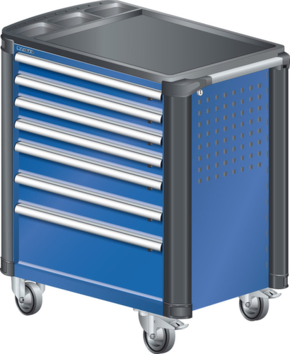 "longDescription": "LISTA Werkstattwagen, Lista Einheit: 36x27E, BxTxH: 894x525x928mm, Schubladen-Nutzfläche BxT: 612x459mm, Anzahl Schubladen: 7, Anzahl Fronthöhen (Tragkraft): 4x75mm (40kg), 2x100mm (40kg), 1x200mm (40kg), Schliessart: Key Lock, Standard-Schliessung mit Wechselyzlinder inkl. 2 Schlüsseln mit Schlüsselnummer, Ausstattung: Mit Kunststoffabdeckung und Kantenschutz inkl. Einzelsicherung rechts, 1 Schiebestange, 2 Bockrollen und 2 Lenkrollen inkl. Feststeller aus Vollgummi mit Ø 100mm, Farbe Gehäuse: Signalblau RAL 5005, Farbe Schubladen: Signalblau RAL 5005. Optimale Traglasten: 40 kg pro Schublade, 400 kg Gehäuse-Tragkraft. Maximale Ausnutzung dank Vollauszug und optimaler Mantelhöhe der Schubladen. Perfekte Arbeitssicherheit: Zentralverschluss und Schubladeneinzel- bzw. Doppelsicherung gegen ungewolltes Öffnen im Fahrbetrieb. Flexible Anpassungsmöglichkeiten durch gelochte Seitenwand und Rückwand für die Aufnahme von Zubehör und Werkzeughaken. Höchster Bedienkomfort mit stabiler, ergonomischer Schiebestange. Volle Mobilität dank je zwei leichtgängiger Bock- und Lenkrollen aus Vollgummi. Zusätzliche Ablage- und Arbeitsfläche durch widerstandsfähige Holzabdeckung oder rutschfeste Kunststoffabdeckung mit Kleinteilefächern. Volle Kompatibilität mit LISTA Einteilungsmaterial durch einheitliches Mass<br>",