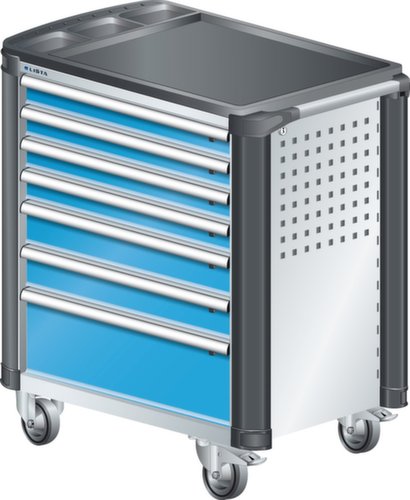 "longDescription": "LISTA Werkstattwagen, Lista Einheit: 36x27E, BxTxH: 894x525x928mm, Schubladen-Nutzfläche BxT: 612x459mm, Anzahl Schubladen: 7, Anzahl Fronthöhen (Tragkraft): 4x75mm (40kg), 2x100mm (40kg), 1x200mm (40kg), Schliessart: Key Lock, Standard-Schliessung mit Wechselyzlinder inkl. 2 Schlüsseln mit Schlüsselnummer, Ausstattung: Mit Kunststoffabdeckung und Kantenschutz inkl. Einzelsicherung rechts, 1 Schiebestange, 2 Bockrollen und 2 Lenkrollen inkl. Feststeller aus Vollgummi mit Ø 100mm, Farbe Gehäuse: Lichtgrau RAL 7035, Farbe Schubladen: Lichtblau RAL 5012. Optimale Traglasten: 40 kg pro Schublade, 400 kg Gehäuse-Tragkraft. Maximale Ausnutzung dank Vollauszug und optimaler Mantelhöhe der Schubladen. Perfekte Arbeitssicherheit: Zentralverschluss und Schubladeneinzel- bzw. Doppelsicherung gegen ungewolltes Öffnen im Fahrbetrieb. Flexible Anpassungsmöglichkeiten durch gelochte Seitenwand und Rückwand für die Aufnahme von Zubehör und Werkzeughaken. Höchster Bedienkomfort mit stabiler, ergonomischer Schiebestange. Volle Mobilität dank je zwei leichtgängiger Bock- und Lenkrollen aus Vollgummi. Zusätzliche Ablage- und Arbeitsfläche durch widerstandsfähige Holzabdeckung oder rutschfeste Kunststoffabdeckung mit Kleinteilefächern. Volle Kompatibilität mit LISTA Einteilungsmaterial durch einheitliches Mass<br>",
