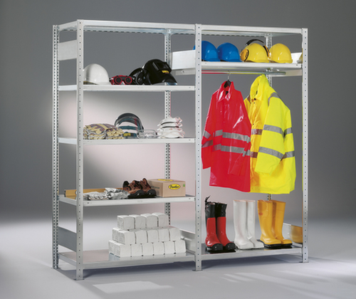 Die wichtigsten Maße des META Garderobenregals CLIP 100 auf einen Blick:Ausgestattet mit Böden und Kleiderstange. Grundregal mit 5 Ablageböden, Anbauregal mit 3 Ablageböden, 1 Kleiderstange. Konstruktion aus Stahl, Ständer mit korrosionsschützender Zinkbeschichtung, Ebenen mit korrosionsschützender Zinkbeschichtung.