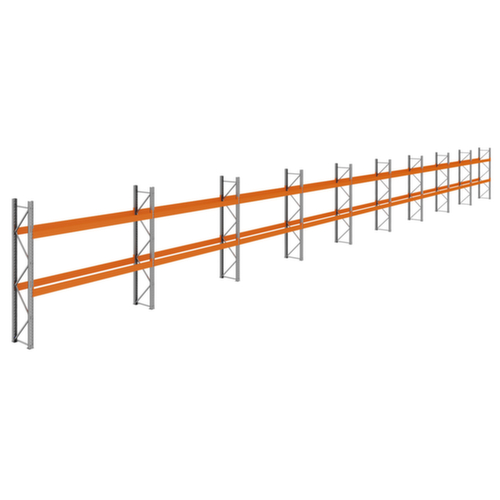Die wichtigsten Maße des Palettenregals auf einen Blick:9 Regalfelder mit je 2 Ebene(n) mit Traversen bieten Lagerkapazität für insgesamt 54 Paletten. Fachhöhen je nach Einsatzzweck und Ihrem Bedarf im Raster von 70 mm verstellbar. Jedes Regalfeld bietet 6 Palettenstellplätze (inkl. Bodenlagerung). Einlagerung quer. Die Längstraversen werden mit Dreihakenklauen und Aushebesicherung in den Ständerrahmen eingehangen. Nutzung einseitig - zur Aufstellung an der Wand konzipiert. Hohe Stabilität durch Auflageträger mit geschlossenen Kastenprofilen. Konstruktion aus Stahl. Ständer mit korrosionsschützender Zinkbeschichtung. Ebenen in RAL2004 Reinorange.