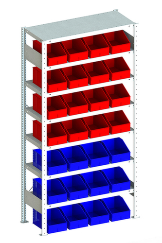 Die wichtigsten Maße des META Behälterregals CLIP S3 100 auf einen Blick:Übersichtliche Kleinteilelagerung auf 7 Ebenen mit Stahlboden und 28 Kästen. Ständer mit korrosionsschützender Zinkbeschichtung. Ebenen mit korrosionsschützender Zinkbeschichtung.
