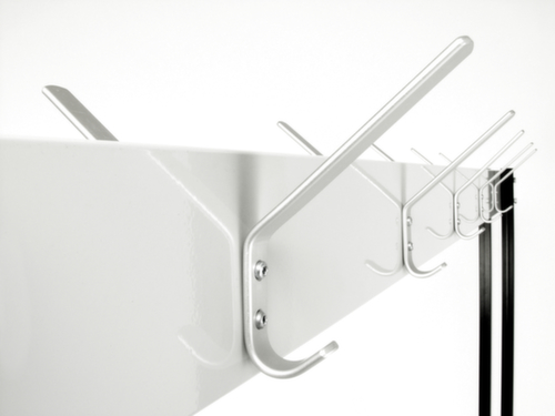 "description": "fahrbar, HxBxT 1800x1500x600mm, 10 Hut-/10 Mantel-/10 Taschenhaken, 4 Lenkrollen, Stahl/Alu, RAL7035/RAL7035",