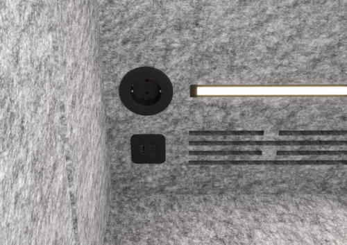 Die Raum-in-Raum-Lösung silent space bietet alles, was Sie für mobiles Arbeiten benötigen: Eine 220V-Steckdose sowie moderne USB-A und USB-C Anschlüsse (je 16 W) ermöglichen das gleichzeitige Laden von Laptop, Smartphone und anderen Geräten – ohne zusätzliche Adapter. Die elegante Integration der Anschlüsse in der Decke sowie die durchdachte Positionierung sorgen für eine aufgeräumte Arbeitsfläche. So bleiben Sie immer verbunden – effizient, modern und unabhängig.