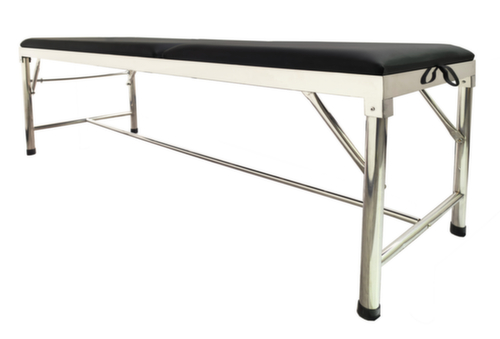 Geeignet für den nichtmedizinischen Bereich. Ideal etwa für Betriebe, Büros oder ähnliche Einrichtungen, wo die im Alltag stets stabile Konstruktion überzeugt. Liegefläche aus High Density-Schaumstoff. Bezug aus Kunstleder in schwarz. Gestell aus Edelstahl.
