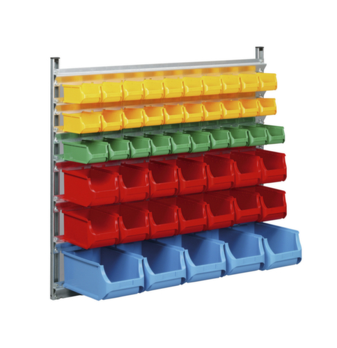 "longDescription": "<h2>Wandregal mit Sichtlagerkästen</h2><p>Das Wandregal mit 49 Sichtlagerkästen ist die passende Aufbewahrungslösung, um Ordnung in Werkstätten, Lager und an Arbeitsplätzen zu schaffen. Dank der Kombination aus einem stabilen Wandregal aus verzinktem Stahlblech und hochwertigen Sichtlagerkästen aus Polypropylen bietet das Set sowohl Robustheit als auch Flexibilität. Vorteile des Wandregals mit Sichtlagerkästen Das Wandregal aus verzinktem Stahlblech ist nicht nur besonders stabil, sondern auch einfach an der Wand zu montieren. So können Sie Ihr Lager- oder Werkstattregal platzsparend und sicher befestigen. Die enthaltenen Sichtlagerkästen sind in vier Farben (rot, blau, gelb und grün) erhältlich, was Ihnen ermöglicht, ein übersichtliches Farbsystem zur Sortierung zu etablieren. Mit den unterschiedlichen Größen der Sichtlagerkästen können sowohl kleine als auch größere Produkte optimal verstaut werden. Diverse Möglichkeiten für jeden Einsatzbereich Mit den insgesamt 49 Sichtlagerkästen bietet das Regal ausreichend Stauraum für eine Vielzahl an Artikeln. Die Maße der Kästen sind wie folgt aufgeteilt: - 20 x Gelb (Maße: 102 x 160 x 75 mm): ideal für Kleinteile wie Schrauben, Nägel oder kleine Ersatzteile. - 10 x Grün (Maße: 102 x 215 x 75 mm): perfekt für mittelgroße Werkzeuge oder Zubehör. - 14 x Rot (Maße: 150 x 235 x 125 mm): gut geeignet für größere Werkstattmaterialien. - 5 x Blau (Maße: 205 x 355 x 150 mm): für sperrigere oder voluminöse Teile. Die Außenmaße des Regals betragen 1130 x 370 x 1050 mm, wodurch das Regal eine kompakte und dennoch geräumige Lösung für die Aufbewahrung Ihrer Produkte bietet. Fazit: Mit diesem Wandregal-Set erhalten Sie eine durchdachte Aufbewahrungslösung, die Ordnung und Effizienz in Ihren Arbeitsbereich bringt. Robust, flexibel und einfach zu montieren - ideal für den professionellen Einsatz. Alternativ zum Wandregal finden Sie in unserem Shop das Sichtlagerkästenregal ebenso als feststehendes Regal sowie als mobiles Regal. Auch eine große Auswahl Sichtlagerkästen finden Sie bei uns.</p><br>",