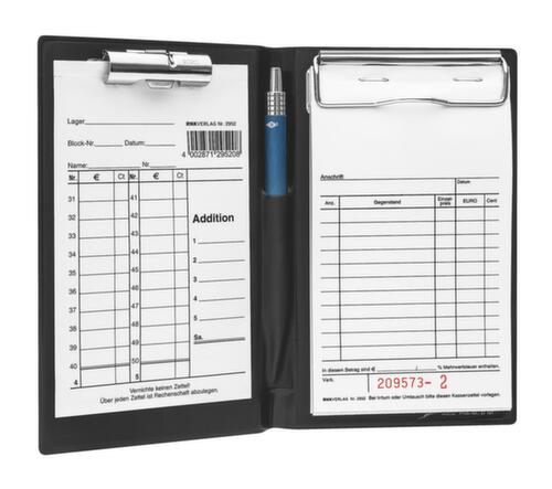 "longDescription": "<h2>Kassenblockhülle</h2><strong>optimal für unterwegs</strong><br><ul><li><strong>Genug Platz und alles dabei</strong> - Blockklemme, Zellteklammer, Stifthalter und transparente Einstecktasche außen</li><li><strong>Leicht und stabil</strong> - aus Karton mit Folienüberzug</li></ul>",